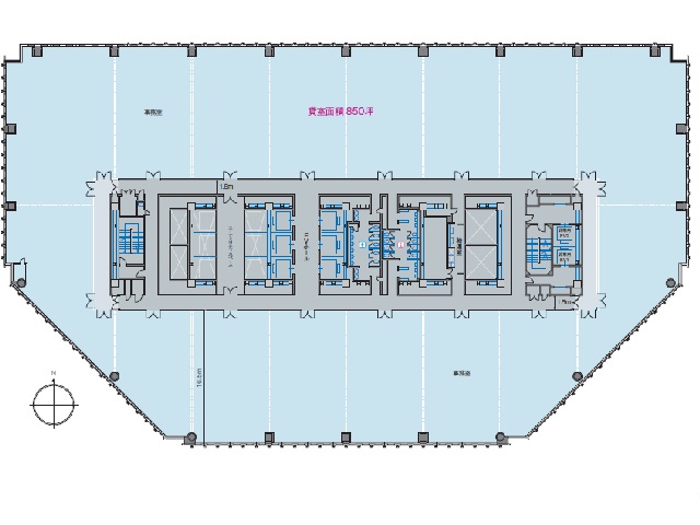 エレベーターや階段、レストルームなどの共用部をフロアに中央に配したセンターコア方式を採用されています。全方位眺望が楽しめるオフィスフロアは、 850坪の無柱空間。グリッドシステム天井と相まって、それぞれのニーズに対応したオフィス空間がデザインできます。 また、さまざまなインテリジェンス・スペックがオフィスの使い勝手と快適性を高めます。