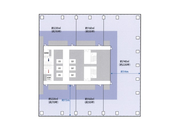 1フロア約480坪、最大5分割を可能としたフロア形状により、フレキシブルなオフィスレイアウトが可能です。