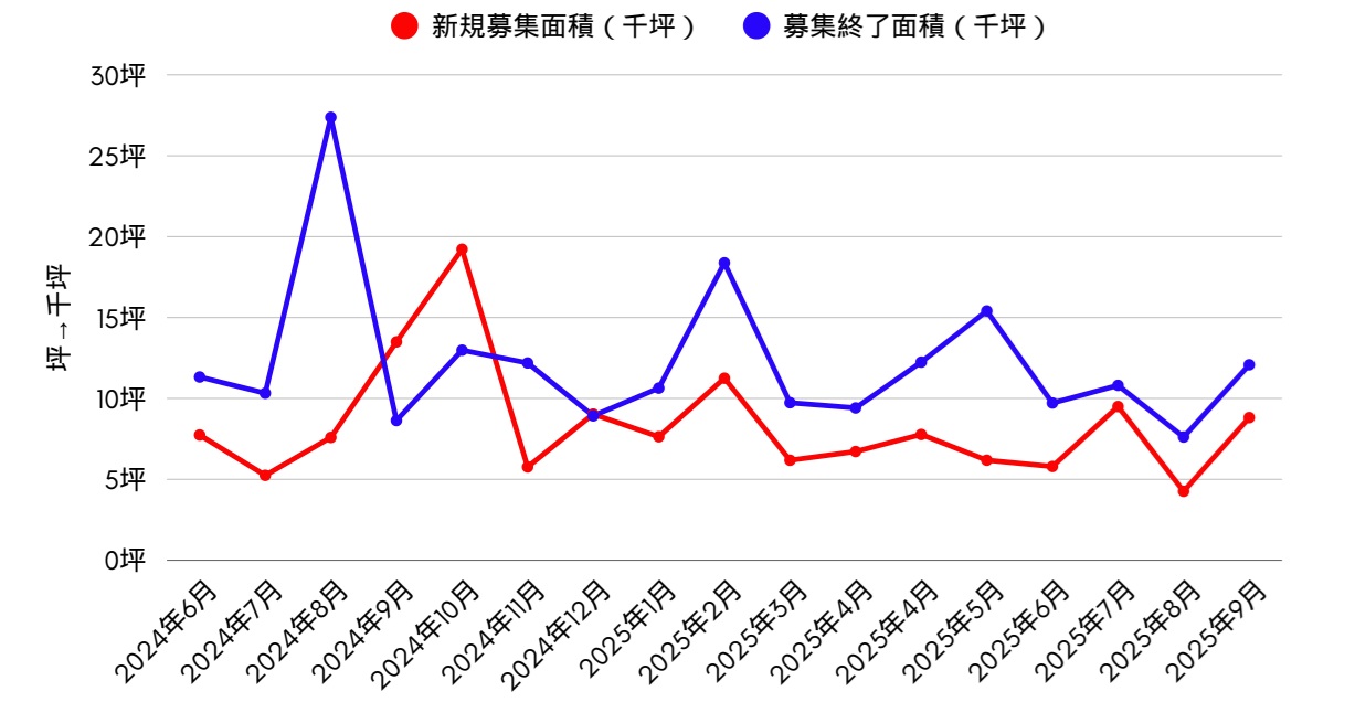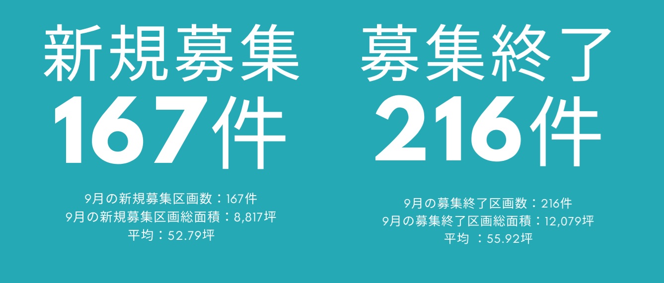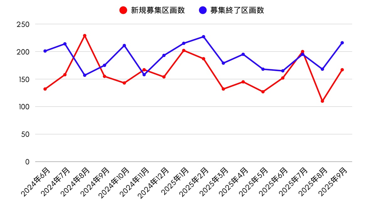 先月(2025年9月)に、弊社の物件データベースに新規募集で追加された物件件数と、契約済みにより募集終了された物件件数です。