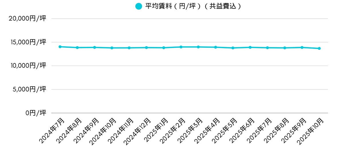 今月の平均賃料(共益費込み)は前月比202円減の 13,679円/坪 となりました。
