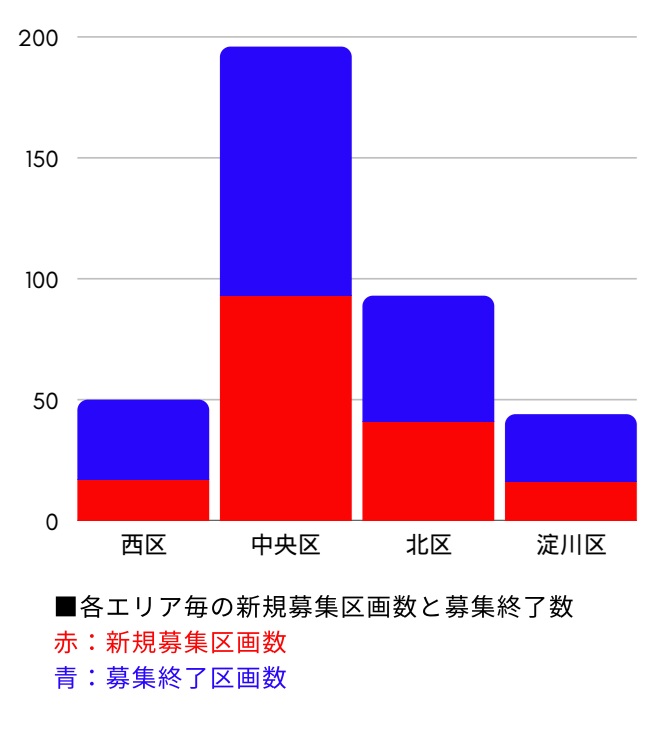 9月も引き続き募集終了が優勢でしたが、平均面積はほぼ同等でした。最も動きが活発だった中央区に関しては面積ベースでは新規募集が優勢と、大きめの床が多く新規募集に加わりました。北区は逆に、面積ベースで大きく募集終了が優勢でした。