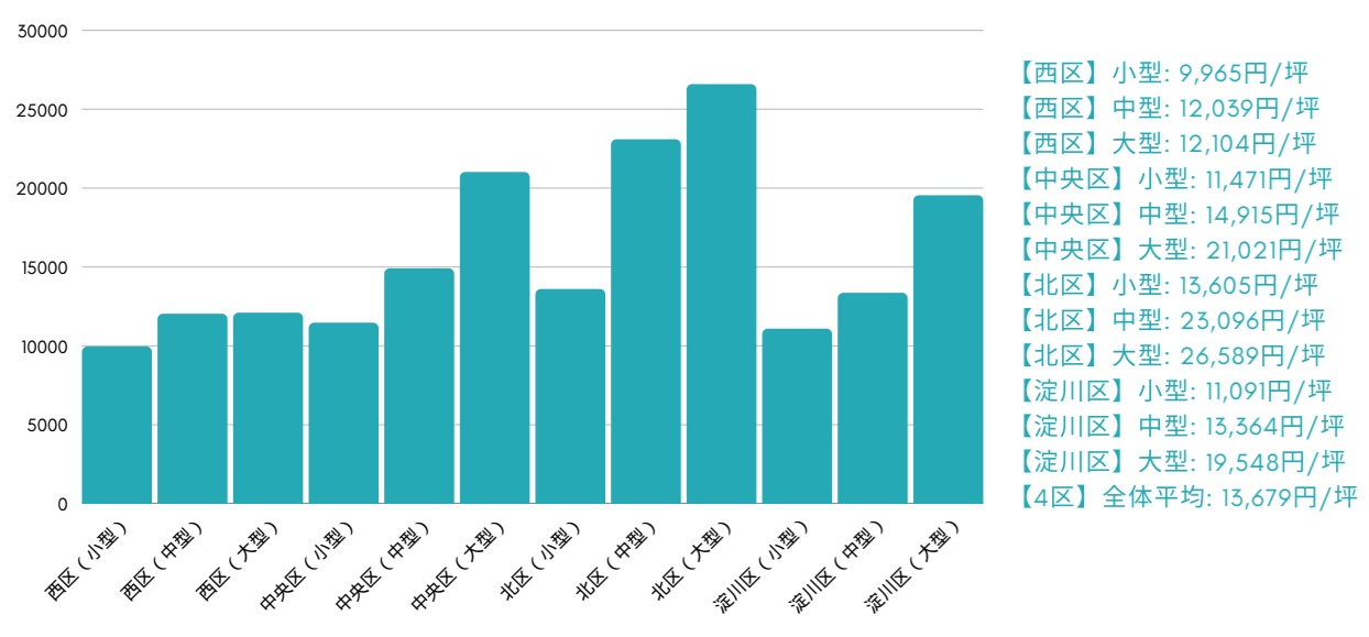 中央区では、面積ベースで見ると新規募集がやや優勢でしたが、募集終了となった大型区画の賃料水準が平均より高かったため、大型区画の平均賃料は約300円下落 しました。