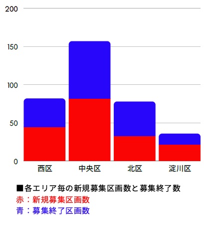 2月は昨年11月以降、3ヵ月ぶりに件数においては新規募集が優勢となりました。しかし、その内100件が西区と中央区の小型区画でした。そのため、面積においては募集終了が引き続き優勢となっています。