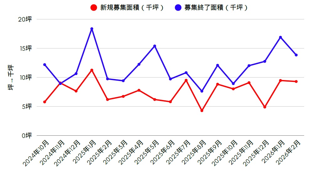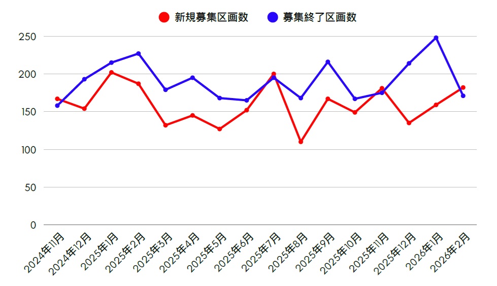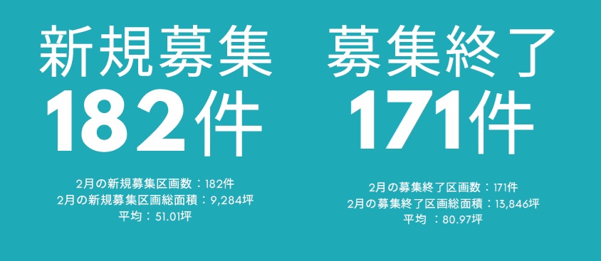 先月(2026年2月)に、弊社の物件データベースに新規募集で追加された物件件数と、契約済みにより募集終了された物件件数です。