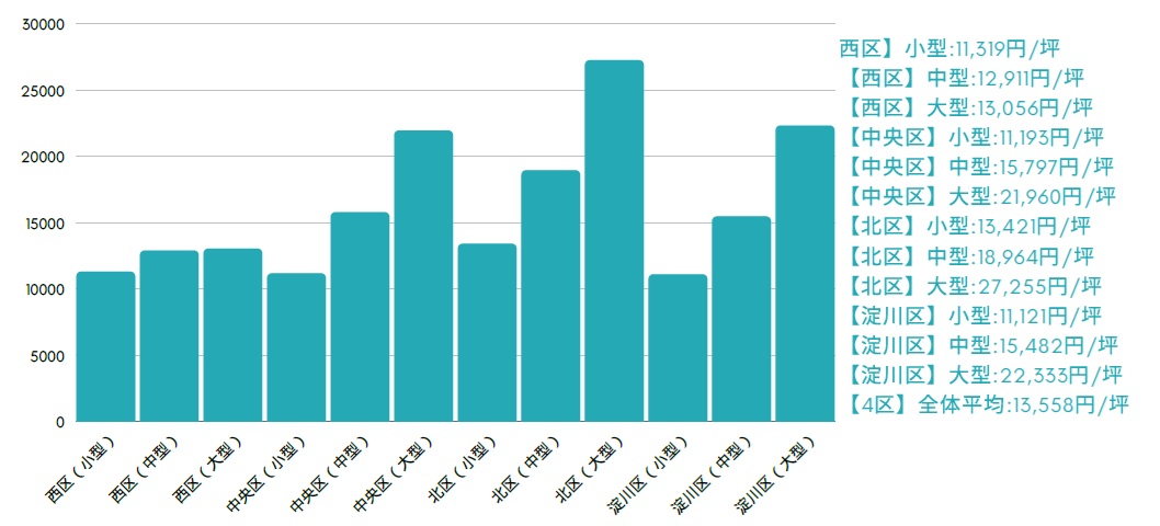 面積に対する加重平均ではなく、区画数に対する単純平均値です。エリア毎の賃料相場を掴んでいただくには、こちらの方がより適切だと判断したため単純平均を採用しております。