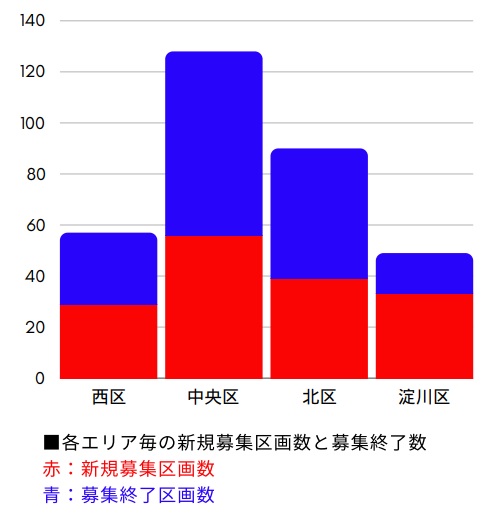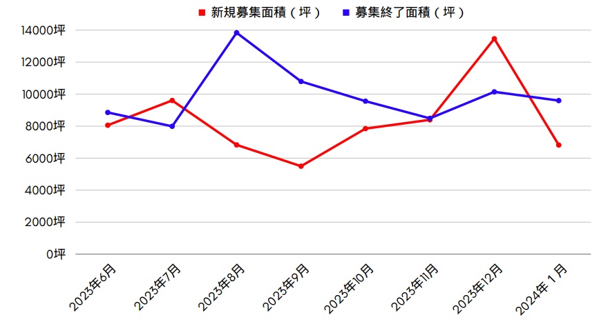 1月は再び募集終了が件数、面積共に優勢となりました。特に面積面では特に差が大きく、拡張移転が多かったことを表しています。実際、直近の弊社の仲介案件も、約8割が拡張と新規開設でした。