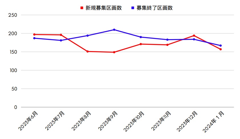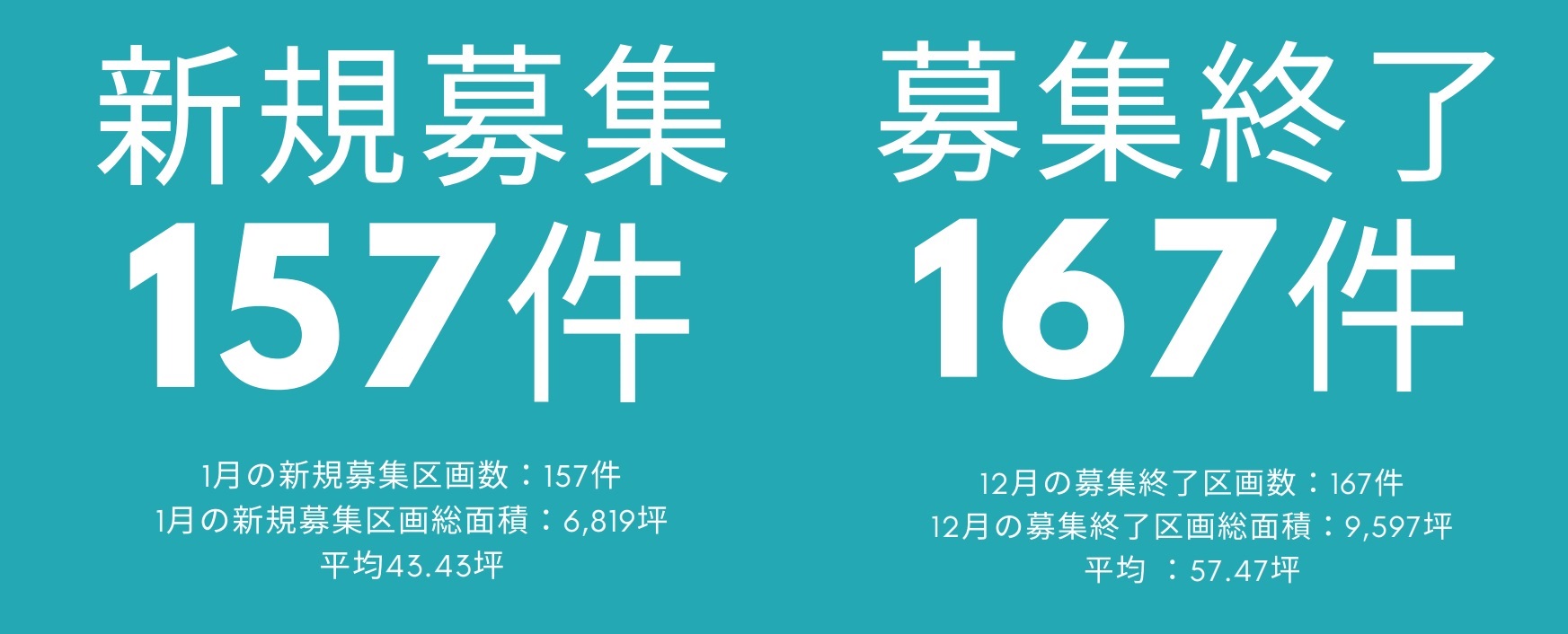 先月(2024年1月)に、弊社の物件データベースに新規募集で追加された物件件数と、契約済みにより募集終了された物件件数です。
