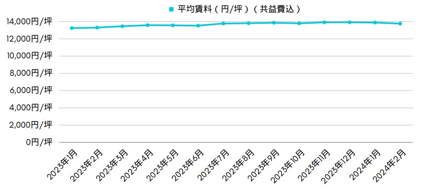 平均賃料は、13,882円/坪(共益費込)と比較して微減と言う結果でした。ただし、賃料の値下がりがあったかと言うとそうではなく、むしろ平均賃料よりも高額な物件の成約が多かったため、募集物件の平均賃料がダウンしたと言えます。