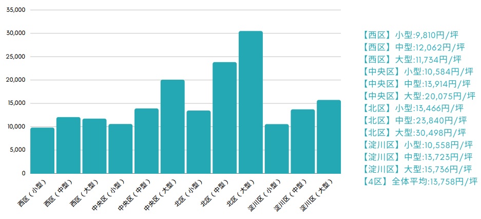 上記のグラフは各エリアの募集賃料単価の平均値です。共益費込・税別の坪単価です。
