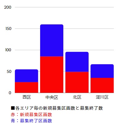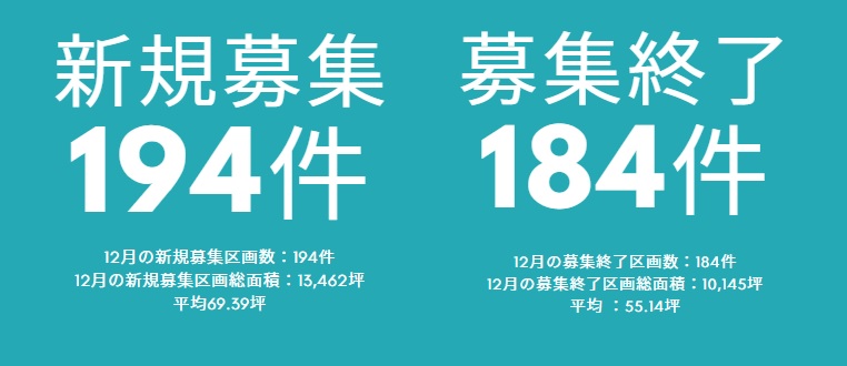 11月までは4ヵ月連続で募集終了が優勢だったために、貸手市場にマーケットが傾いて来ています。しかし、12月は新規募集が優勢だったため、これが継続すれば、反転して来る可能性もございます。