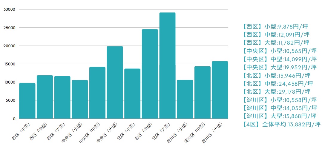 面積に対する加重平均ではなく、区画数に対する単純平均値です。エリア毎の賃料相場を掴んでいただくには、こちらの方がより適切だと判断したため単純平均を採用しております。