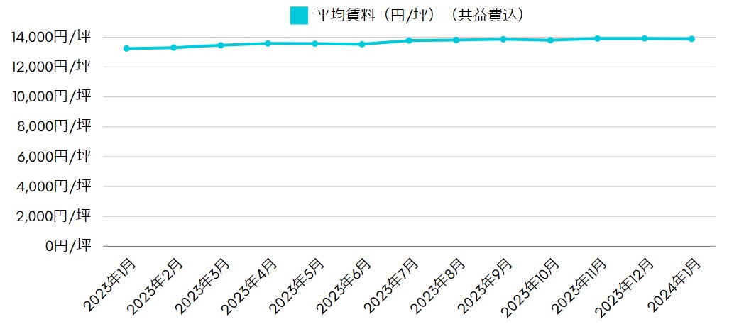 平均賃料は、12月の13,914円/坪(共益費込)と比較して微減となりました。ただし、今月に関してはどのエリアのどの面積帯も、特段大きな相場の変化は無かった印象です。とは言え、実際の成約条件ベースでは、値下げ交渉が通り難くなって来ております。数ヵ月前までは取れていた値下げ条件も、取れなくなったビルが増えて来ています。また、空室過多によりキャンペーンを実施していた物件の空室率が順調に下がったことで、年末を一つの区切りとしてキャンぺーンを終了する物件も増えて来ています。