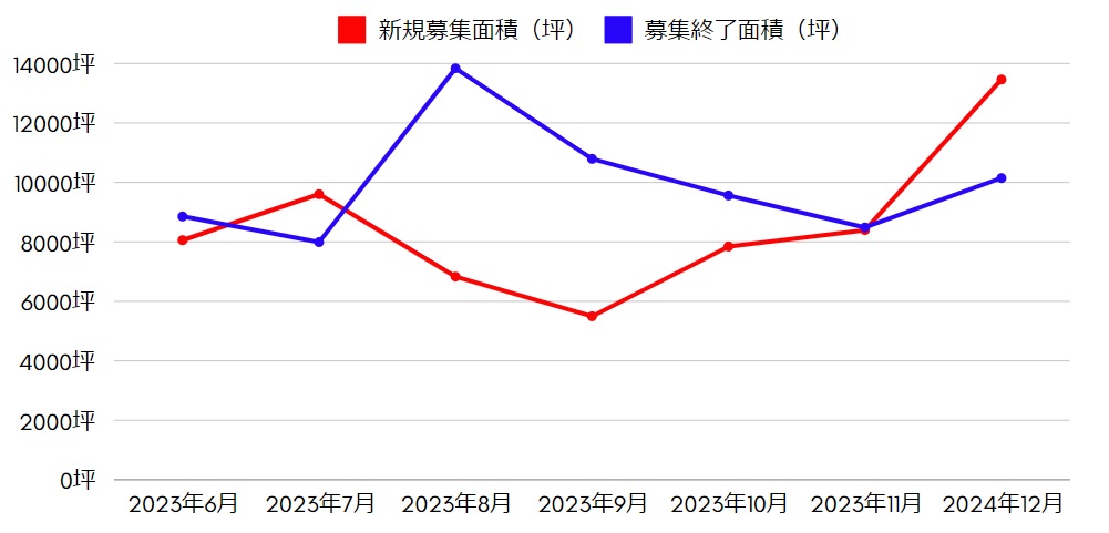 12月は5ヶ月ぶりに件数面積共に新規募集が優勢となりました。ただし、募集終了も前月比で件数、面積共に増加しています。年内に契約締結を終え、来年の春以降、GWあたりを目途に移転を完了させたいという企業様の契約ラッシュが多かった印象です。