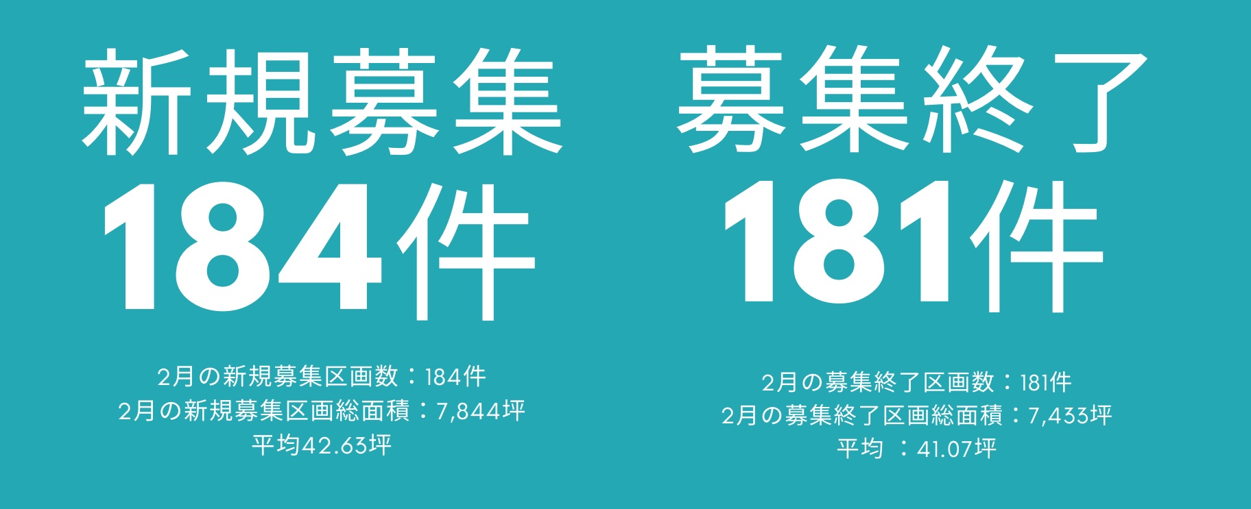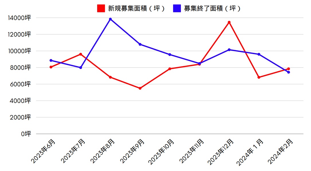2月は新規募集と募集終了が、件数も面積もほぼ同等と言う結果でした。ここまで同等と言うのは珍しいです。ただし、同面積帯への移転は特になく、拡張移転と縮小移転がバランスよく有ったためです。