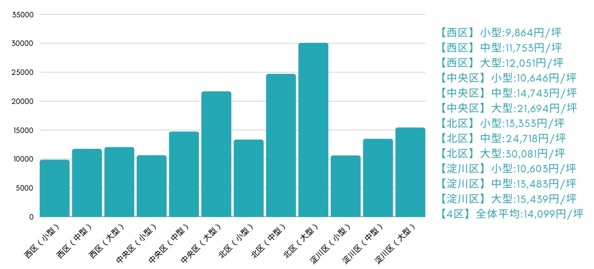 面積に対する加重平均ではなく、区画数に対する単純平均値です。エリア毎の賃料相場を掴んでいただくには、こちらの方がより適切だと判断したため単純平均を採用しております。