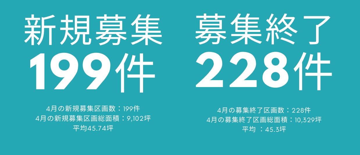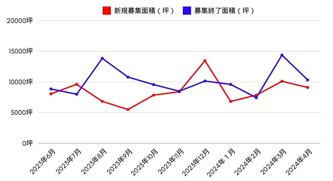 4月は募集終了が優勢でした。現場の体感的にも、新規募集から募集終了までのペースが速くなっている印象です。特に最近では、拡張移転のみならず、縮小コスト削減の事例も増えています。