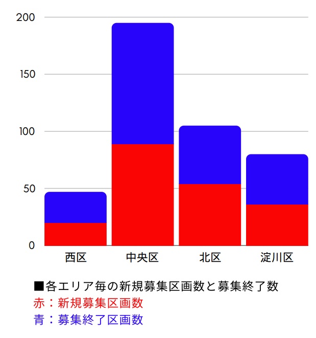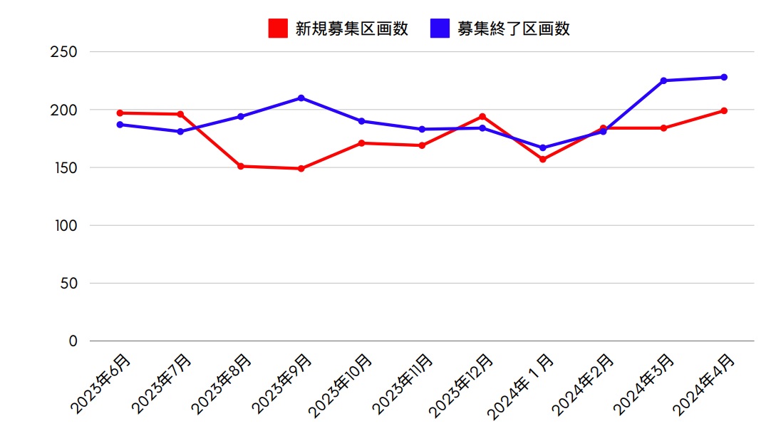 先月(2024年5月)に、弊社の物件データベースに新規募集で追加された物件件数と、契約済みにより募集終了された物件件数です。