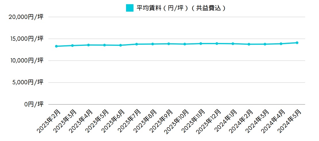 平均賃料は、先月の13,869円/坪(共益費込)と比較して100円/坪以上増加しました。