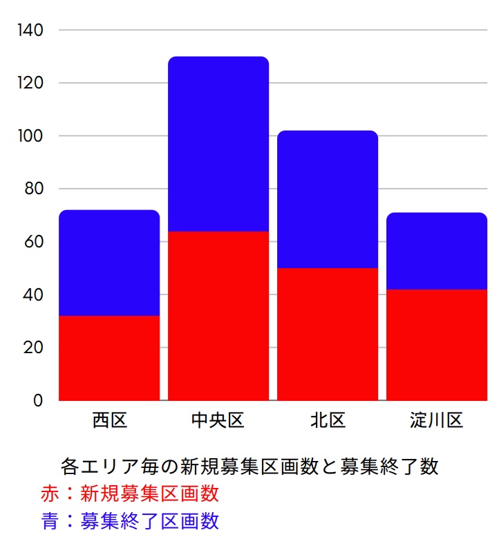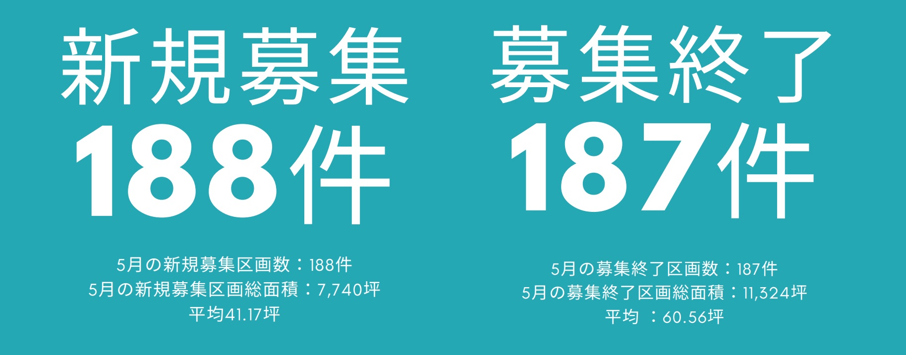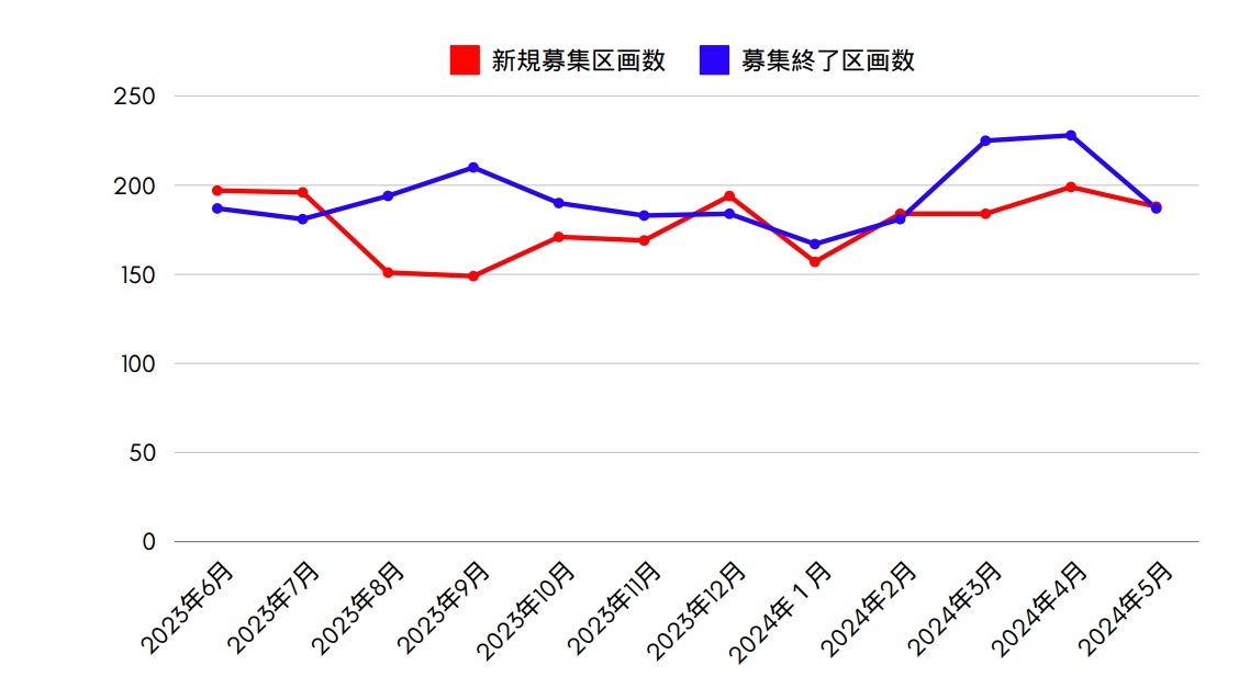 先月(2024年5月)に、弊社の物件データベースに新規募集で追加された物件件数と、契約済みにより募集終了された物件件数です。