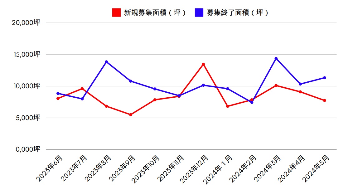 5月は件数はほぼ同じでしたが、面積ベースでは募集終了が大きく優勢でした。再び拡張移転が多かったことを示唆しています。また、平均値の比率が示す通り、微増での移転ではなく、今後の拡張性も視野に入れた、1.5倍前後の大幅な拡張移転が目立ちました。