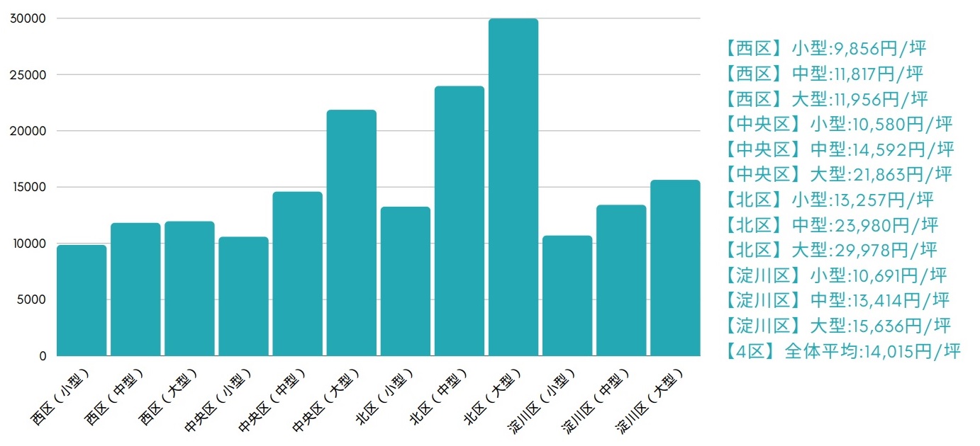 面積に対する加重平均ではなく、区画数に対する単純平均値です。エリア毎の賃料相場を掴んでいただくには、こちらの方がより適切だと判断したため単純平均を採用しております。