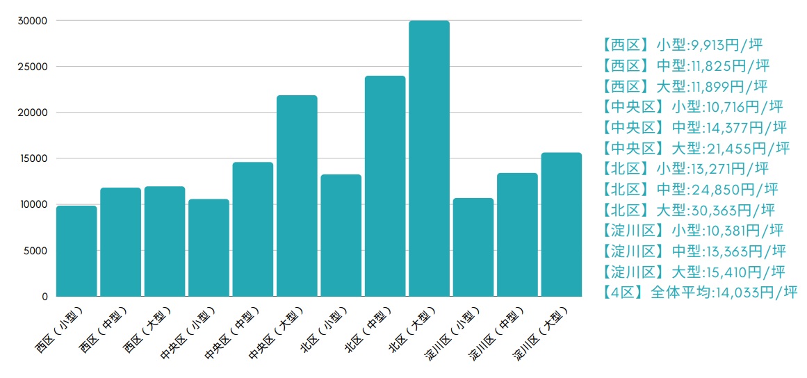 面積に対する加重平均ではなく、区画数に対する単純平均値です。エリア毎の賃料相場を掴んでいただくには、こちらの方がより適切だと判断したため単純平均を採用しております。