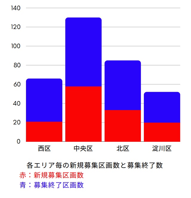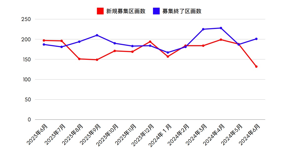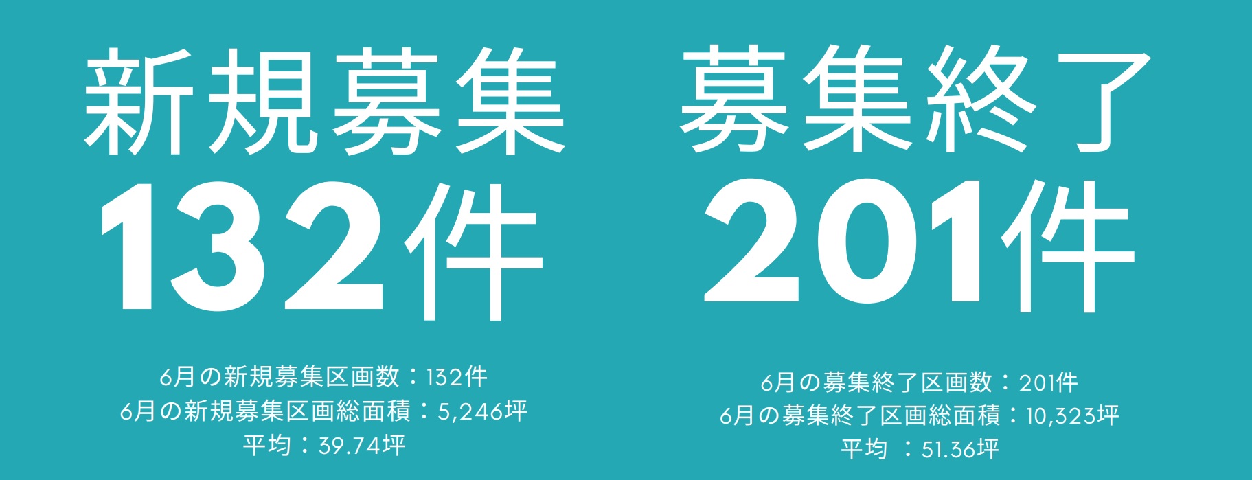 先月(2024年6月)に、弊社の物件データベースに新規募集で追加された物件件数と、契約済みにより募集終了された物件件数です。