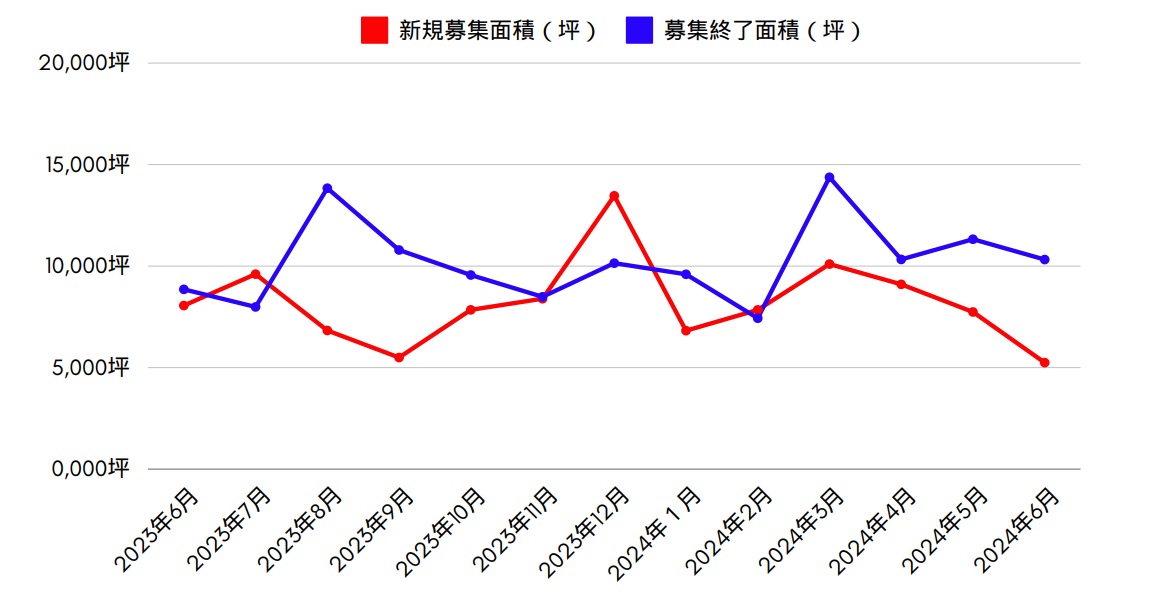 6月は件数・面積共に大幅に募集終了が優勢となりました。募集終了優勢はここ最近続いていましたが、今月はその差は特に大きくなりました。拡張移転が優勢が多い事に加え、館内増床による募集終了が多いことから、ここまで件数に差が付いたのだと思われます。