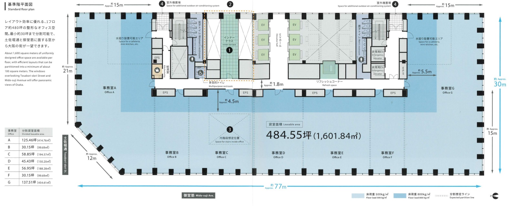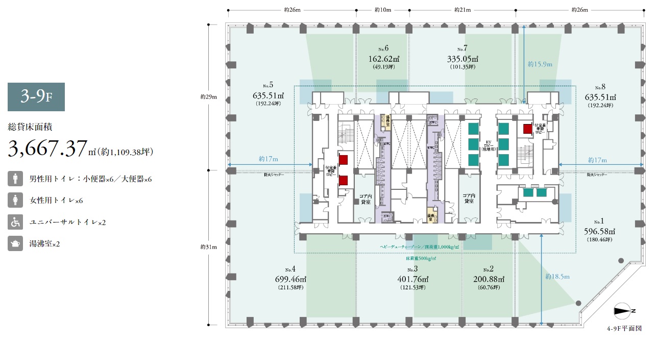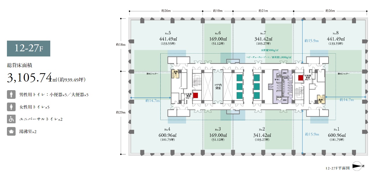 | 基準階面積 | 484.55坪 | 中層・高層(13F~27F):939坪 低層(3F~9F):1,109坪 |