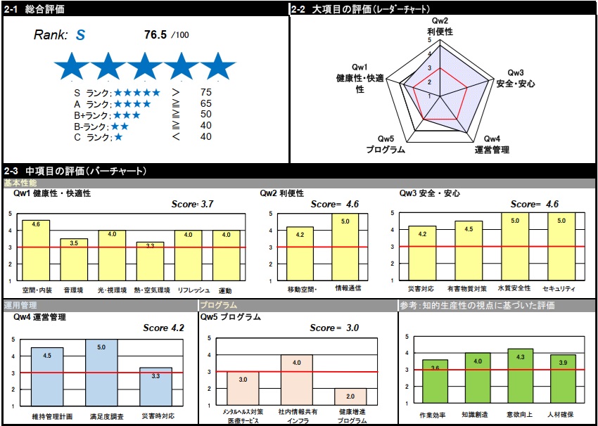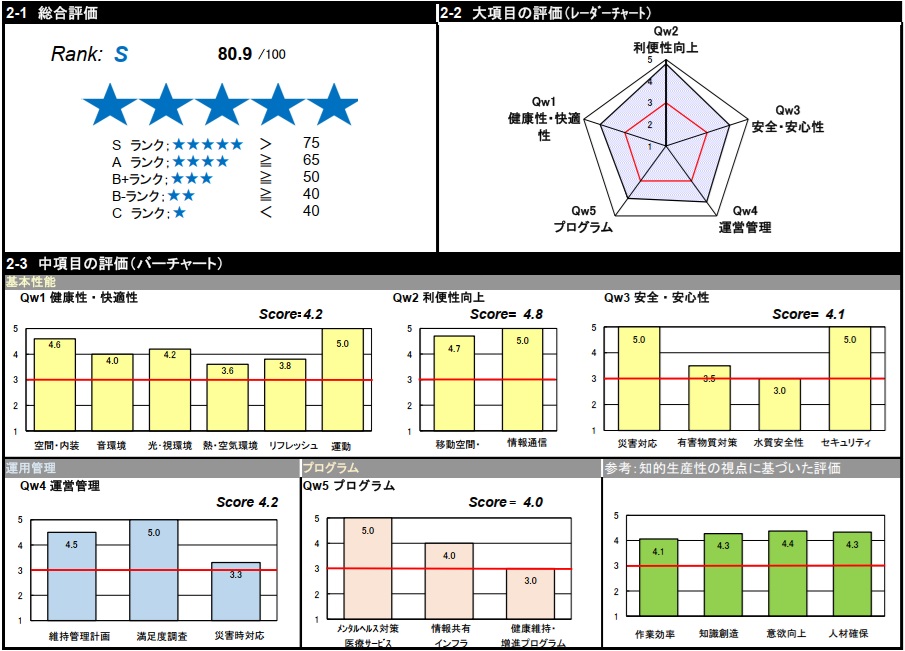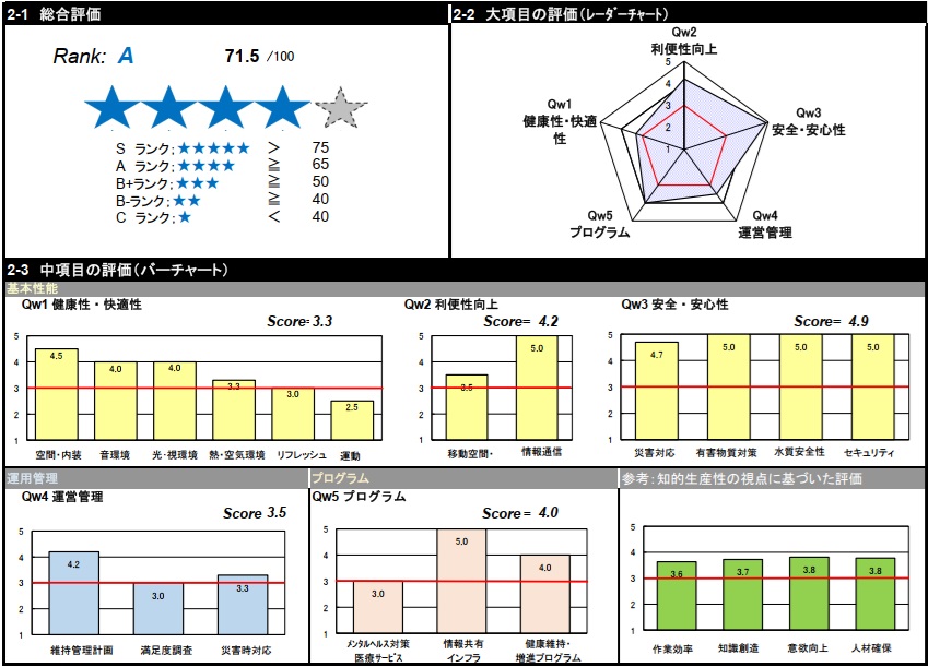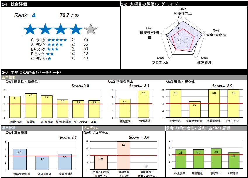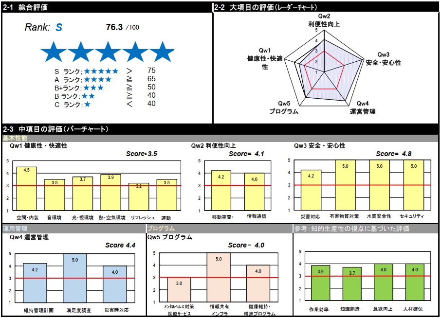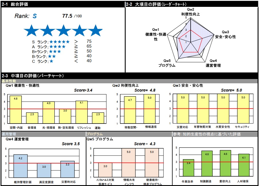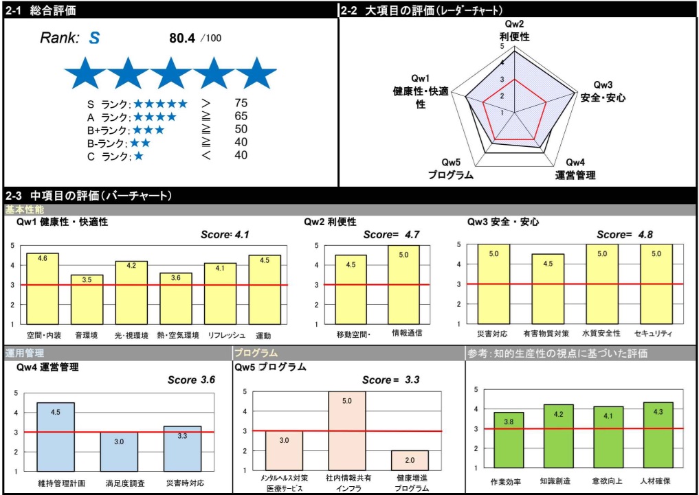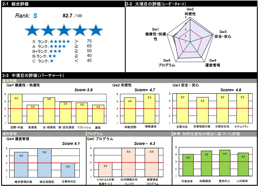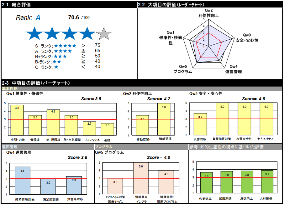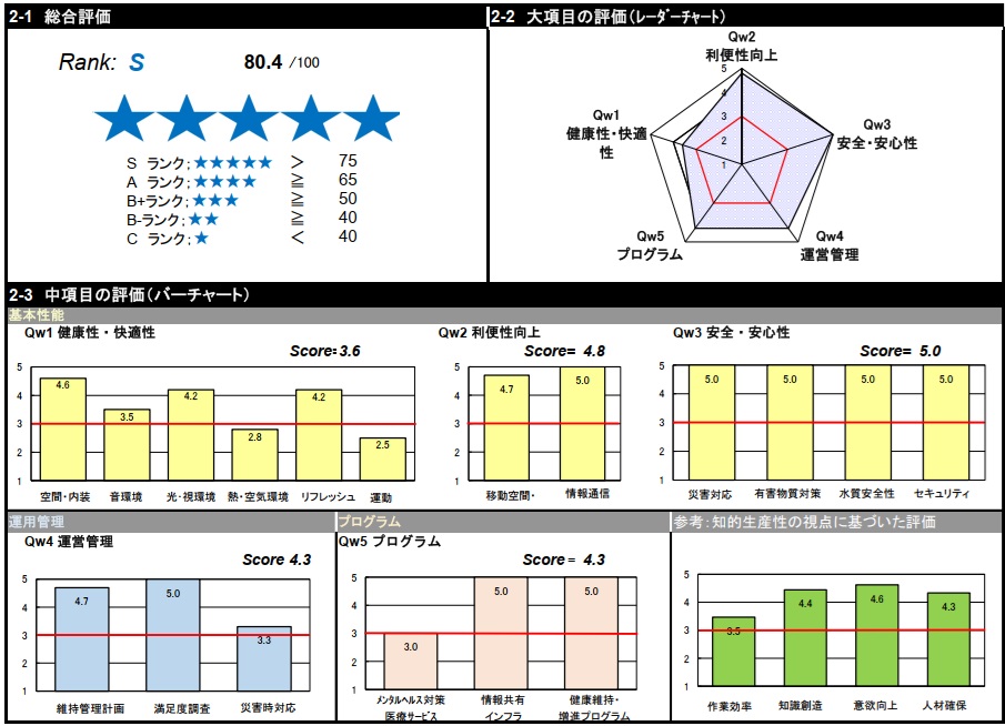 上記の各評価項目の5段階評価の結果をもとに総合得点を算出することで、CASBEEウェルネスオフィスのランクが評価されています。