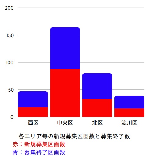 面積において、新規募集の中央区に大量供給が有りますが、こちらは既存ビルの新規募集ではなく、2棟の大型再開発物件の募集が始まったことによる増加です。この2棟の新規募集を除けば、中央区の新規募集は2737坪となりますので、例月とほぼ同等となります。
