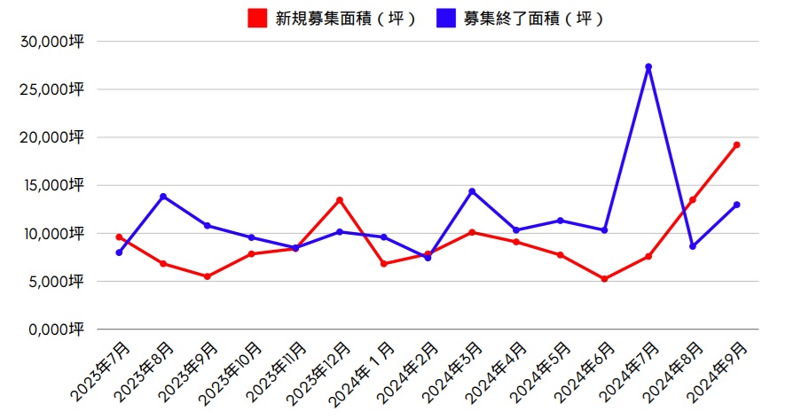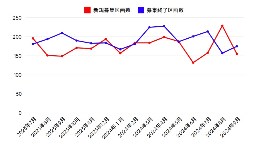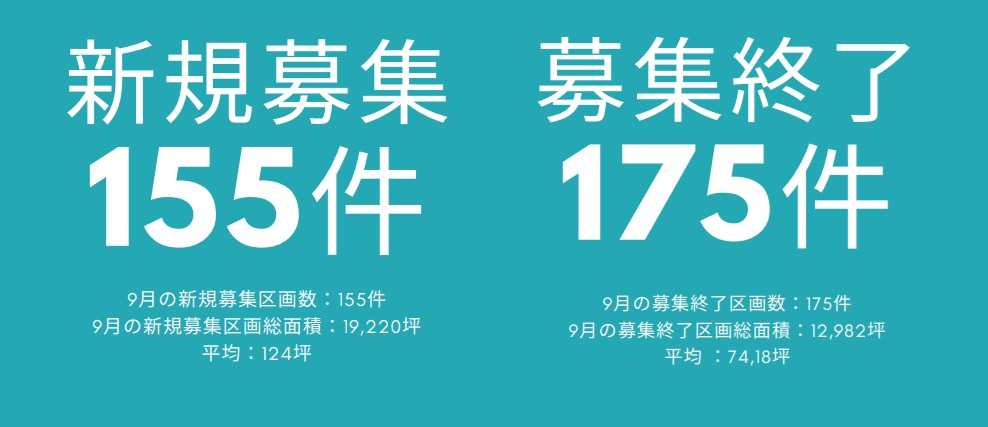 先月(2024年9月)に、弊社の物件データベースに新規募集で追加された物件件数と、契約済みにより募集終了された物件件数です。