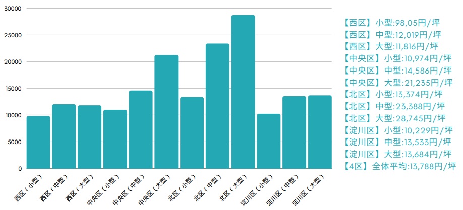 面積に対する加重平均ではなく、区画数に対する単純平均値です。エリア毎の賃料相場を掴んでいただくには、こちらの方がより適切だと判断したため単純平均を採用しております。