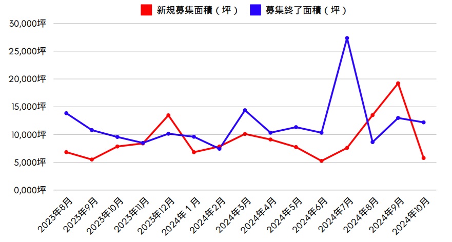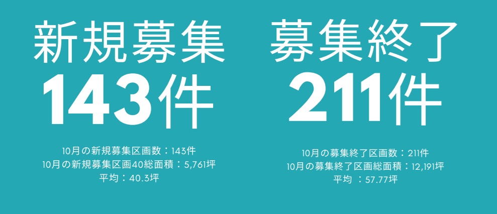先月(2024年10月)に、弊社の物件データベースに新規募集で追加された物件件数と、契約済みにより募集終了された物件件数です。