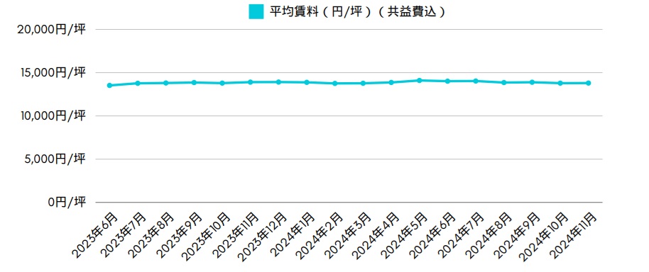 上記のグラフは各エリアの募集賃料単価の平均値です。共益費込・税別の坪単価です。