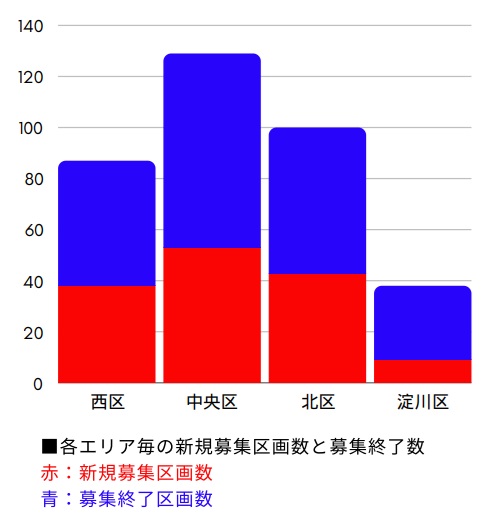 10月は大幅かつ4区全てにおいて募集終了が優勢でした。特に淀川区が顕著で、新規募集が少数だったものの、募集終了は例月以上に好調でした。同エリア内での移転と言うよりも、他エリアから新大阪駅周辺へ移転する動きが多かったようです。