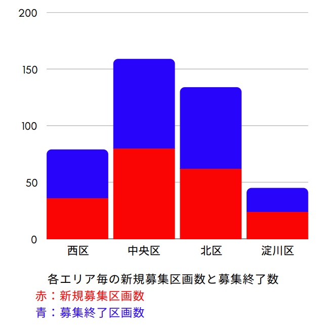 件数の差は若干でしたが、面積差は大きく1.5倍近く募集終了の方が大きい結果でした。拡張移転やフロア統合移転が多かったためです。また、イノゲート大阪やグラングリーン大阪のフロア単位の大きな契約が年末年始に集中したことから、北区の募集終了面積が跳ね上がりました。