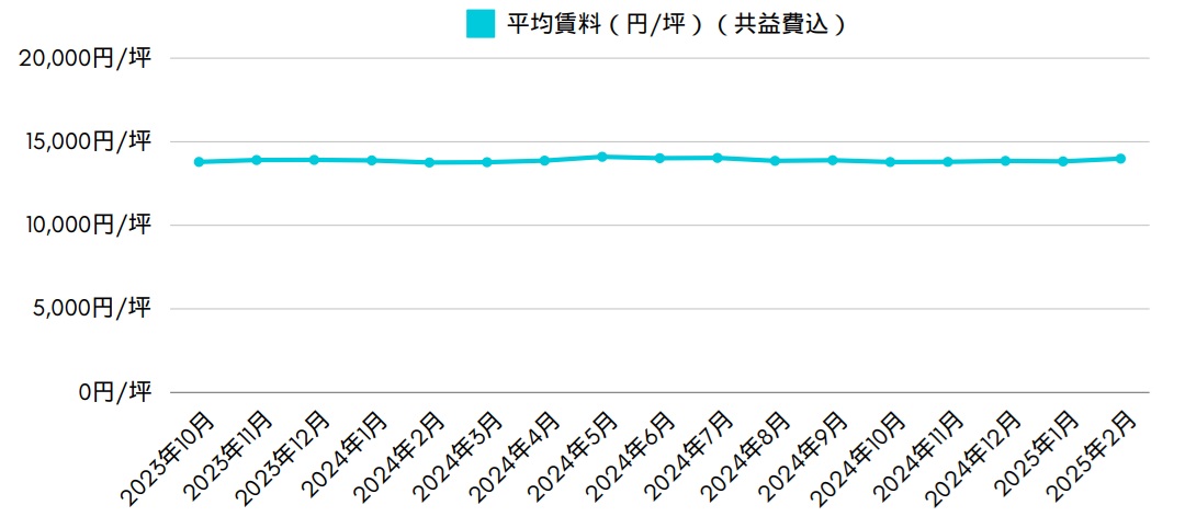 平均賃料は、先月の13,824円/坪(共益費込)と比較して+164円と比較的大きく増加しました。
