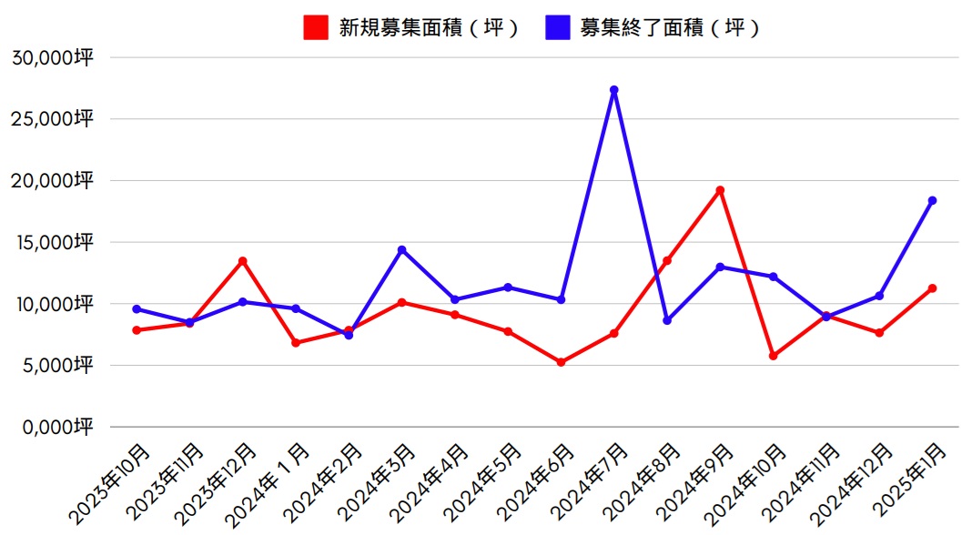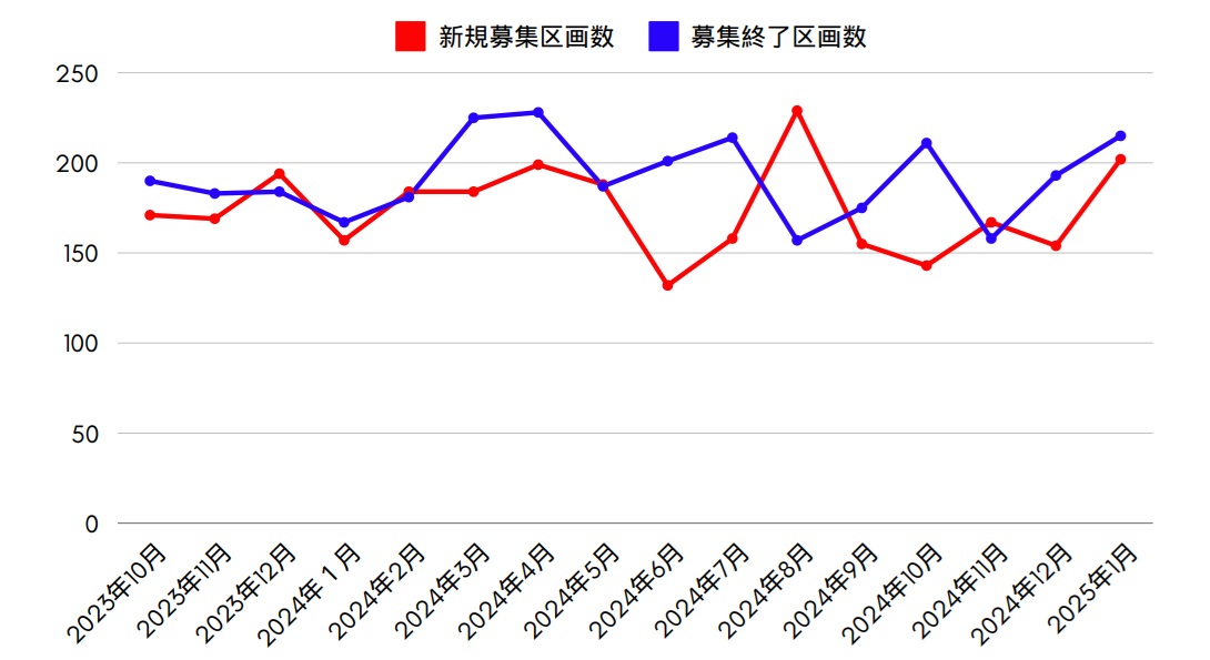 先月(2025年1月)に、弊社の物件データベースに新規募集で追加された物件件数と、契約済みにより募集終了された物件件数です。
