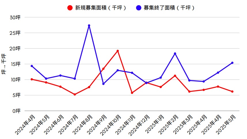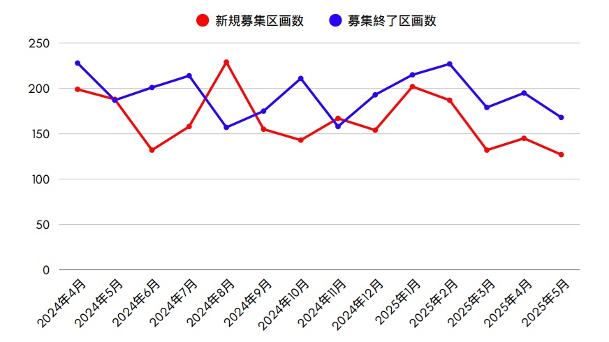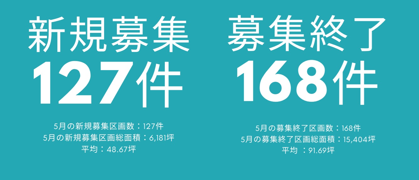 先月(2025年5月)に、弊社の物件データベースに新規募集で追加された物件件数と、契約済みにより募集終了された物件件数です。