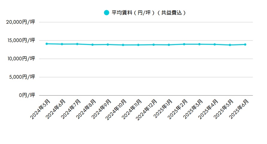 今月の平均賃料は、先月の13,784円/坪(共益費込)から122円/坪上昇しました。