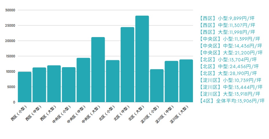 面積に対する加重平均ではなく、区画数に対する単純平均値です。エリア毎の賃料相場を掴んでいただくには、こちらの方がより適切だと判断したため単純平均を採用しております。