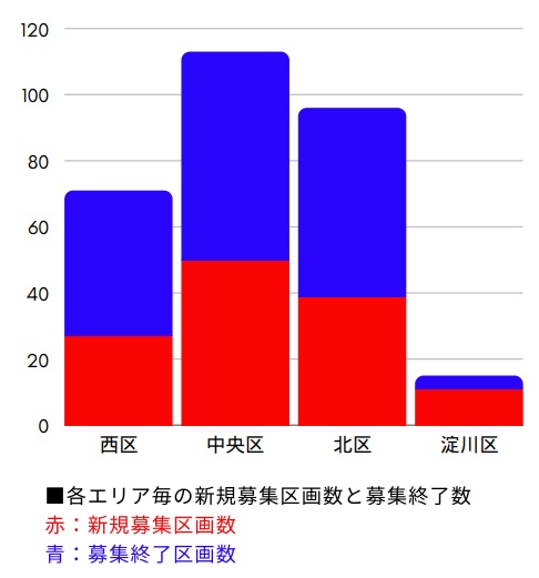 5月はGWもあり営業日数が少なかったためか、件数は先月より少なめでしたが、募集終了面積が北区を中心に非常に大きい結果となりました。ただしこちらは、大阪駅周辺の再開発ビルのデータ更新が行われたことによる変化で、実際に契約締結がなされたのが5月と言う訳では有りません。